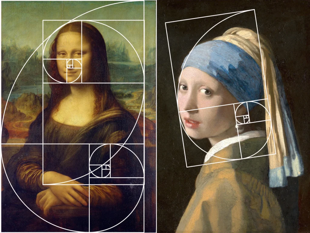 The Golden Ratio is also said to appear in both architecture and art. This is usually demonstrated by overlaying the Golden Ratio on a painting. Using this method you can “reveal” the golden ratio in classical paintings such as Leonardo da Vinci’s “Mona Lisa” (1503–1506) and Johannes Vermeer’s “Girl With a Pearl Earring” (1665):