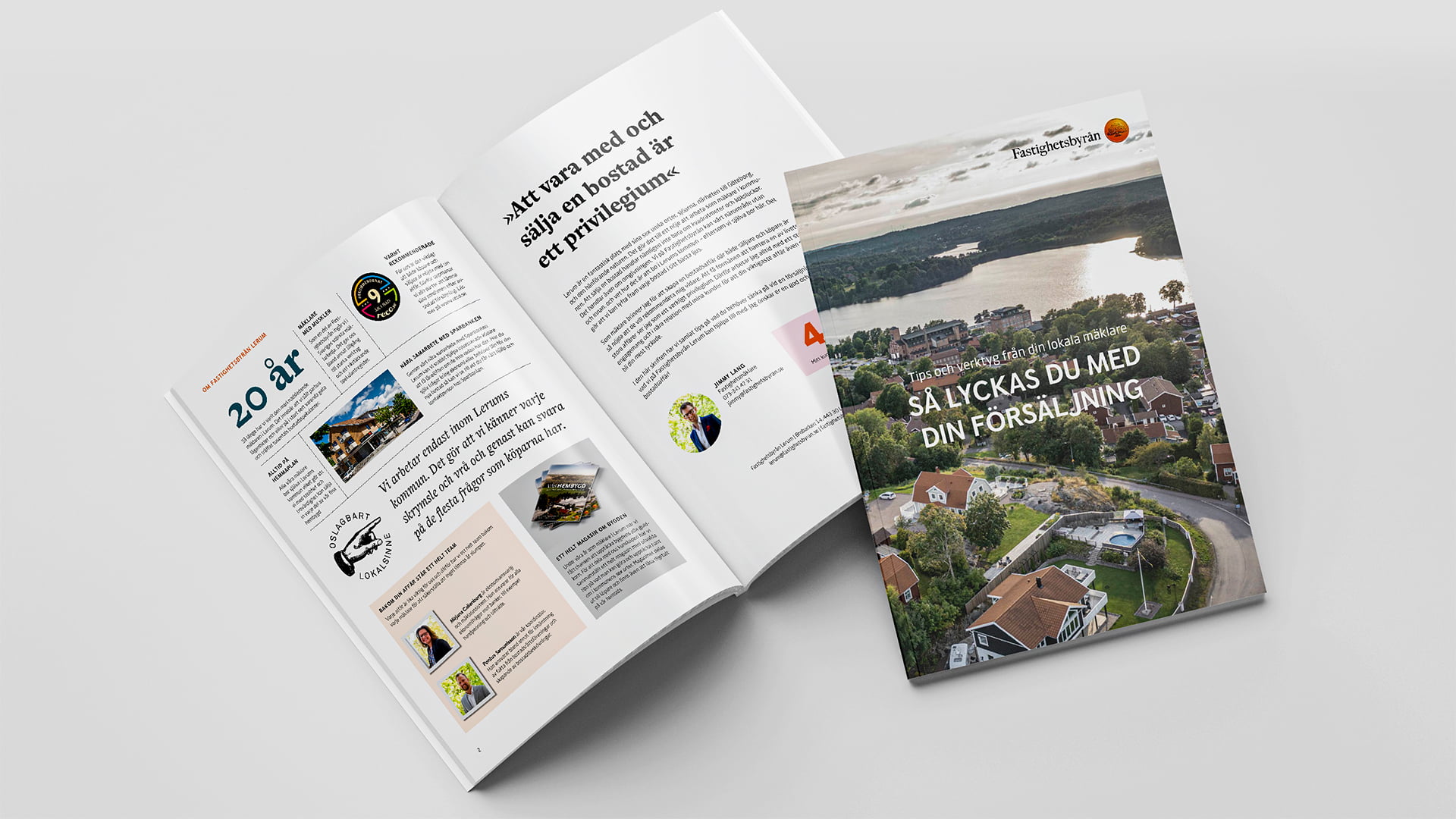 Fastighetsbyrån Lerum är marknadsledande inom sitt geografiska område. Deras främsta konkurrensfördelar är deras omsorg, engagemang och kunskap. Detta ville de skulle skina igenom när de bad Peanuts Kommunikationsbyrå att ta fram nytt intagsmaterial.